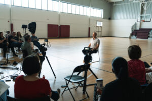 Inside the gymnasium, rows of folding chairs face a small interview setup. The space, typically used for recreation, has been temporarily transformed into a storytelling hub. Lighting stands cast a soft glow, while cables snake across the polished floor. It is here that voices—both prominent and unheard—are being recorded.